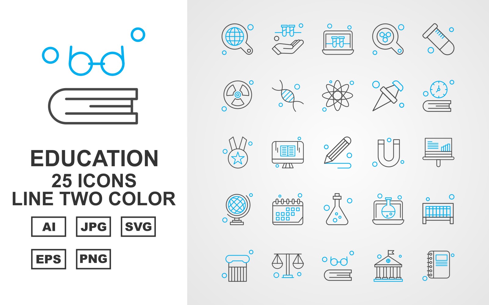 Download Набор иконок "25 Premium Education Line Two Color Icon Set" / 25 Premium Education Line Two Color Icon Set - Набор иконок на тему science find,lcd,laptop,test tube,column,balance,book,university,hand,radiation,dna,atom,icon,icons,magnet,analytics