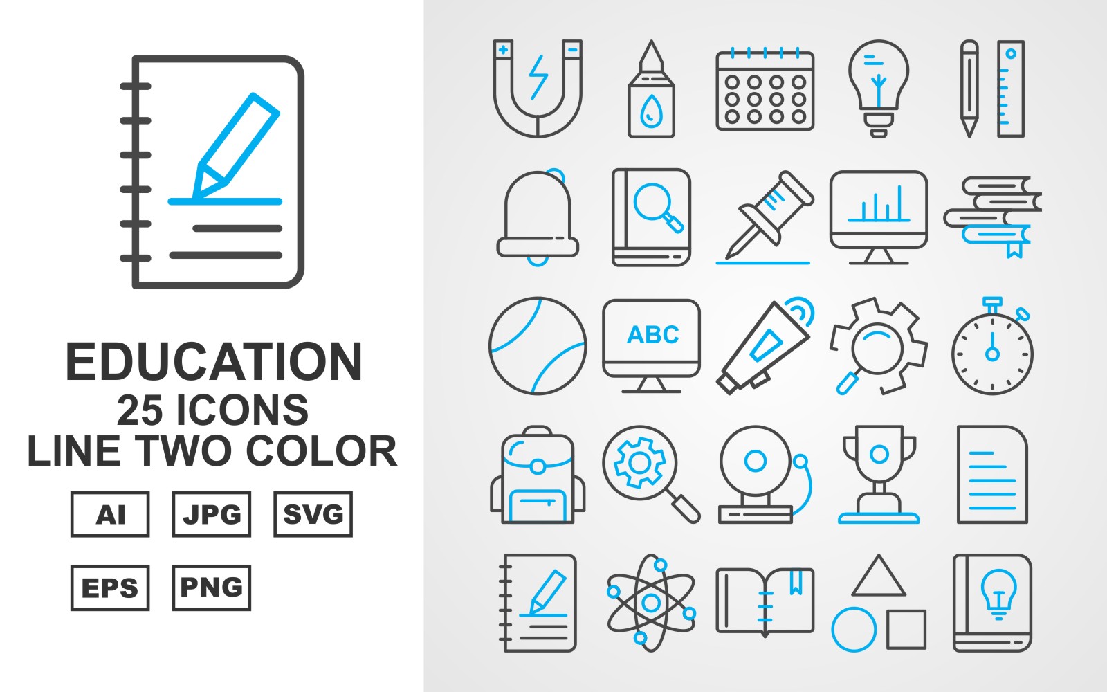 Download Набор иконок "25 Premium Education Line Two Color Icon Set" / 25 Premium Education Line Two Color Icon Set - Набор иконок на тему science magnet,bulb,bag,bell,award,document,atom,geometry,lcd,book,bookmark,building,ink,calculator,glue,calendar,pencil,pin,analytics,books