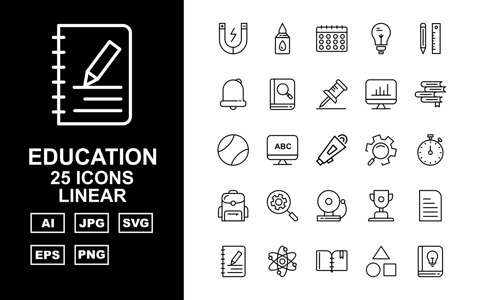 Download Набор иконок "25 Premium Education Linear Icon Set" / 25 Premium Education Linear Icon Set - Набор иконок на тему science magnet,bulb,bag,bell,award,document,atom,geometry,lcd,book,bookmark,building,ink,calculator,glue,calendar,pencil,pin,analytics,books