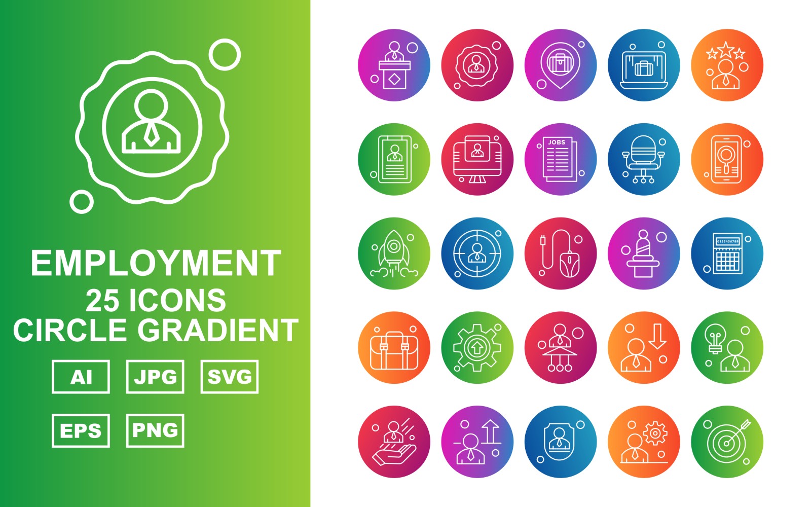 Download Набор иконок "25 Premium Employment Circle Gradient Icon Set" / 25 Premium Employment Circle Gradient Icon Set - Набор иконок lecture,focus,avatar,worker,employee,aim,briefcase,laptop,cv,lcd,curriculum vitae,chair,mobile,rocket,mouse,user,calculator,baggage,setting,icon
