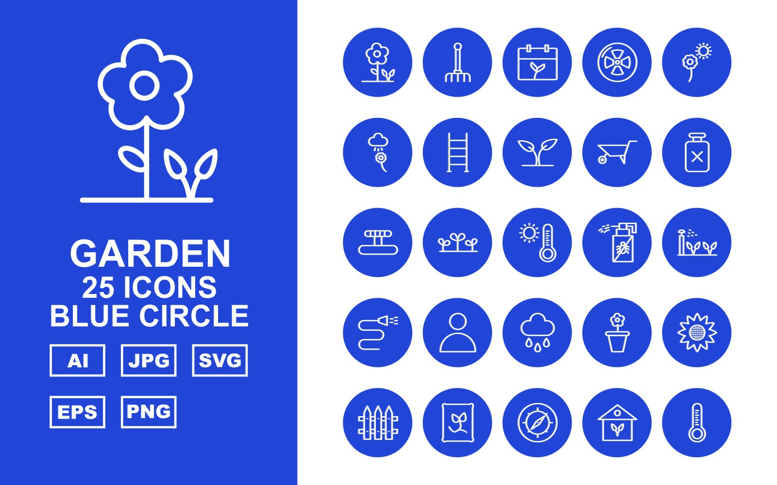 Download Набор иконок "25 Premium Garden Blue Circle Icon Set" / 25 Premium Garden Blue Circle Icon Set - Набор иконок на тему nature flower,radiacion,hose,cloud,pot,sunflower,farming,seeds,house,plant,compass,thermometer,tap,boot,bucket,shovel,pitchfork,rake,calendar,ladder