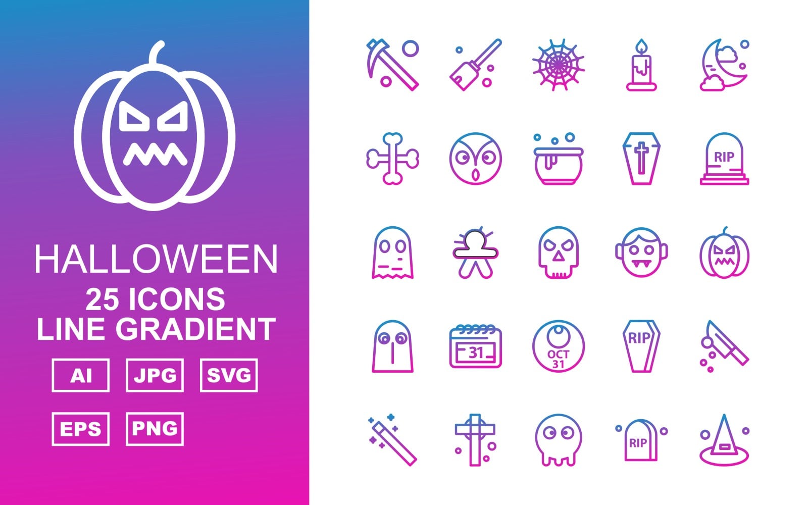 Download Набор иконок "25 Premium Halloween Line Gradient Pack Icon Set" / 25 Premium Halloween Line Gradient Pack Icon Set - Набор иконок на тему culture scythe,voodoo,grave,knife,wand,celtic,ghost,magic,broom,candle,midnight,bone,vampirefreaks,cauldron,coffin,freaks,icon,icons