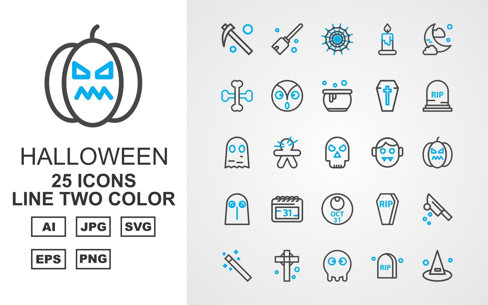 Download Набор иконок "25 Premium Halloween Line Two Color Pack Icon Set" / 25 Premium Halloween Line Two Color Pack Icon Set - Набор иконок на тему culture scythe,voodoo,grave,knife,wand,celtic,ghost,magic,broom,candle,midnight,bone,vampirefreaks,cauldron,coffin,freaks,icon,icons