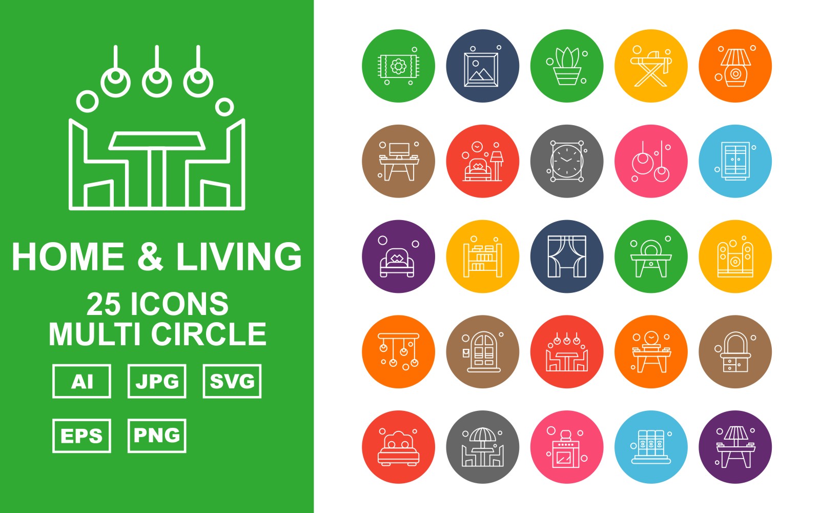 Download Набор иконок "25 Premium Home And Living Multi Circle Icon Pack Set" / 25 Premium Home And Living Multi Circle Icon Pack Set - Набор иконок на тему city carpet,bookshelf,table,dresser,bedroom,dinner,kitchen,book,lamp,image,pot,lump,clock,bulb,window,couch,speaker,chandeliers,icon,icons