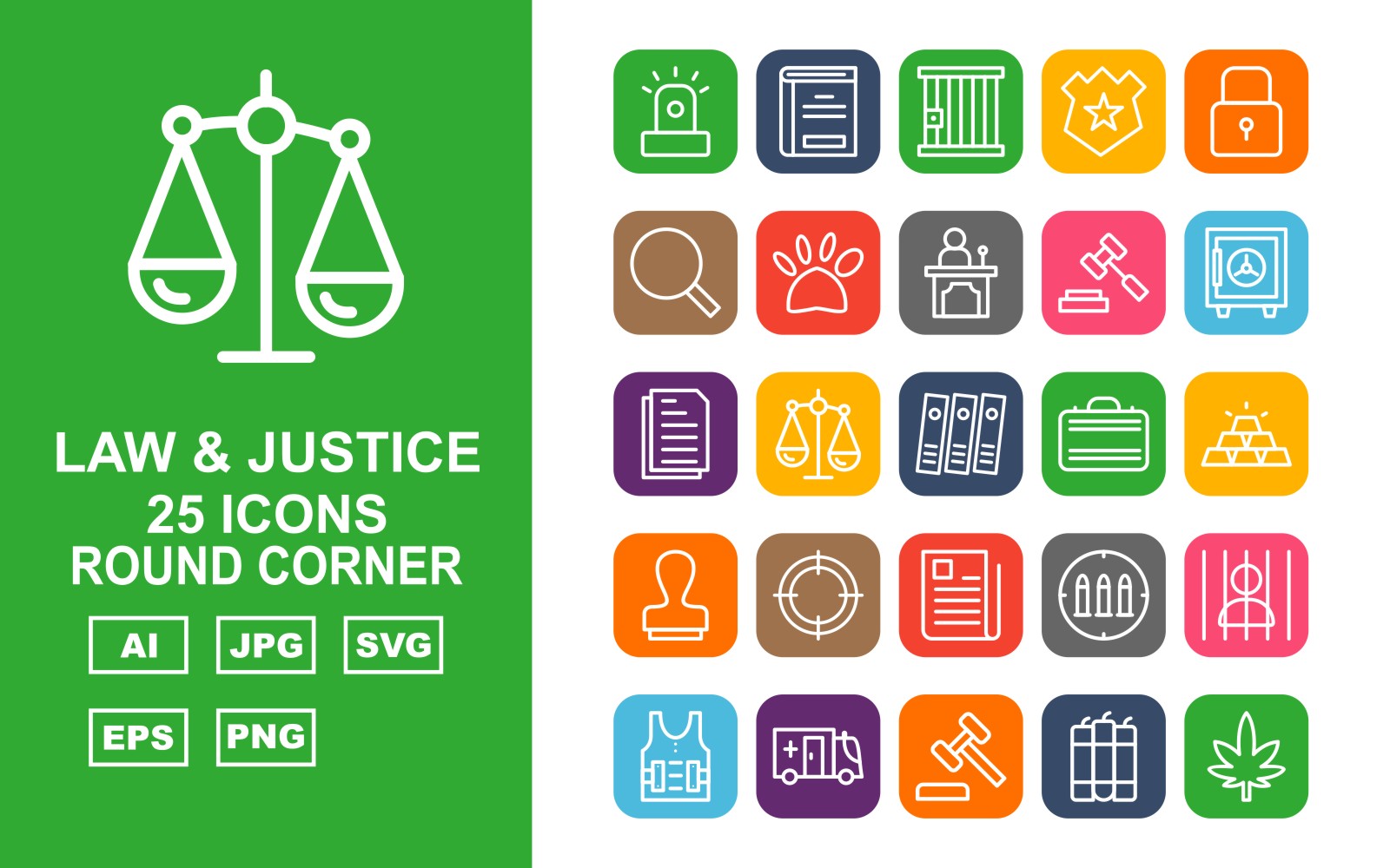 Download Набор иконок "25 Premium Law And Justice Round Corner Pack Icon Set" / 25 Premium Law And Justice Round Corner Pack Icon Set - Набор иконок на тему military car light,justice,finger,appeal,cctv,police cap,gun,police car,handcuff,sack,read,convicted,enforcement,lock,find,dog print,witness,law and justice,vault,icon