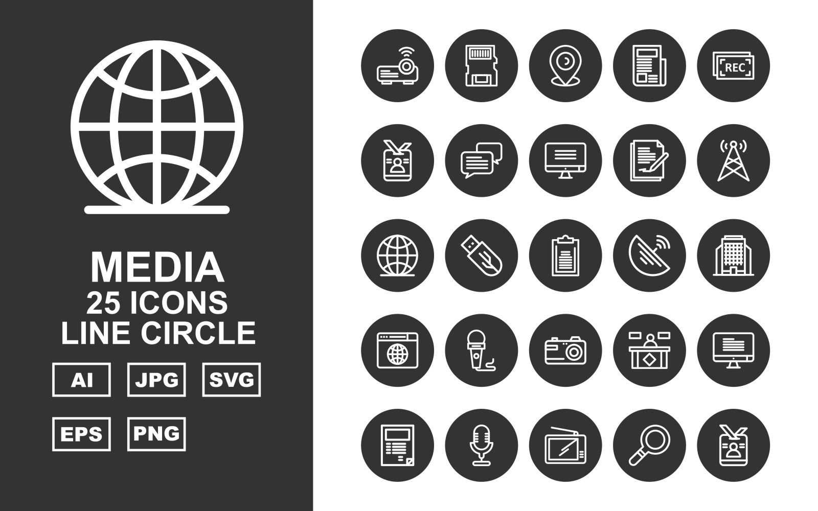 Download Набор иконок "25 Premium Media Line Circle Icon Set" / 25 Premium Media Line Circle Icon Set - Набор иконок на тему data projector,usb,camera,reception,led,book,microphone,television,find,memory card,id card,chat,document,tower,earth,satellite dishes,building,icon,icons