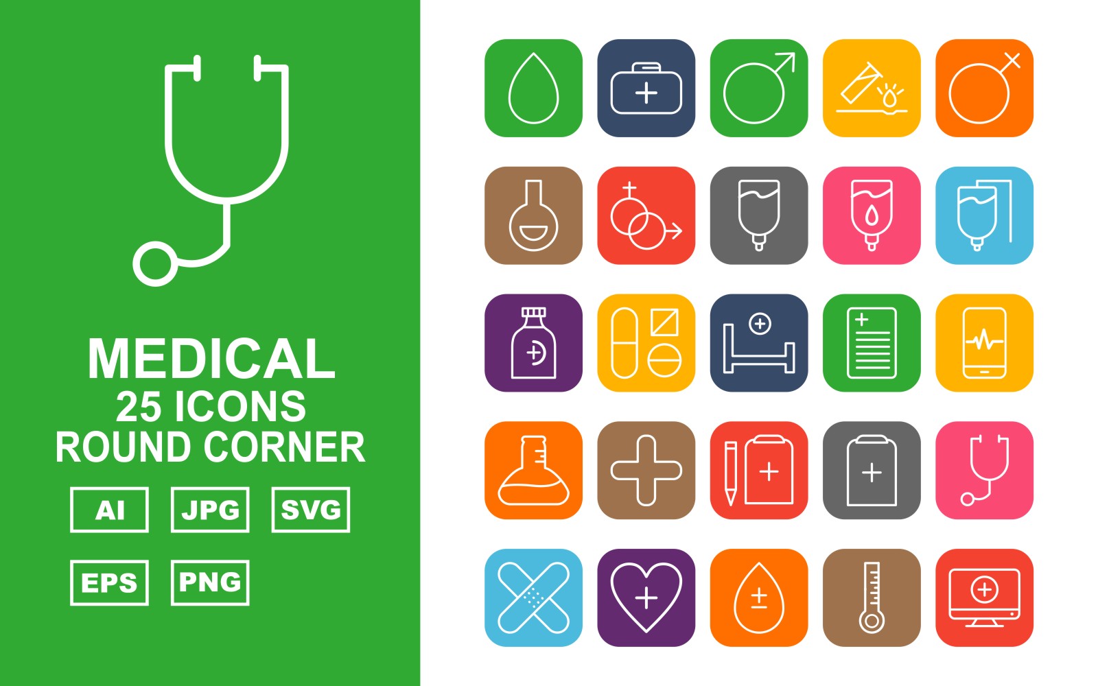 Download Набор иконок "25 Premium Medical Round Corner Icon Set" / 25 Premium Medical Round Corner Icon Set - Набор иконок на тему medical drop,flask,add,clipboard,stetoscop,bandage,heart,tablet,thermometer,lcd,eye,beat,heartbeat,briefcase,gender,bottle,bed,report,online,icon