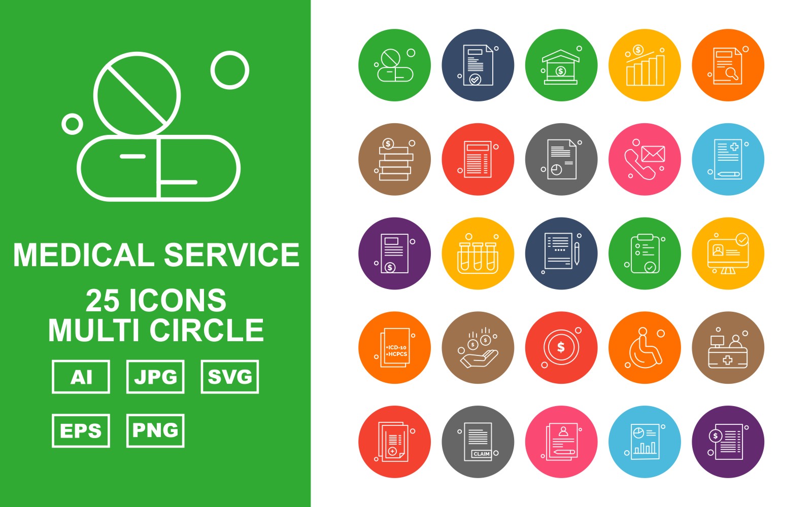 Download Набор иконок "25 Premium Medical Service Multi Circle Icon Pack Set" / 25 Premium Medical Service Multi Circle Icon Pack Set - Набор иконок на тему medical medical capsule,test tube,patient,reception,report,document,bar graph,home,chart,coin,telephone,notepad,lcd,donuts,icon,icons
