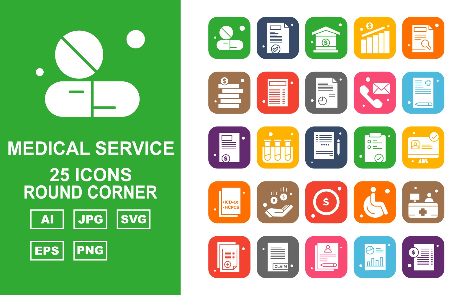 Download Набор иконок "25 Premium Medical Service Round Corner Icon Pack Set" / 25 Premium Medical Service Round Corner Icon Pack Set - Набор иконок на тему medical medical capsule,test tube,patient,reception,report,document,bar graph,home,chart,coin,telephone,notepad,lcd,donuts,icon,icons