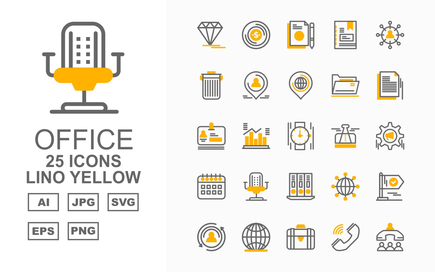 Download Набор иконок "25 Premium Office III Lino Yellow Pack Icon Set" / 25 Premium Office III Lino Yellow Pack Icon Set - Набор иконок на тему финансы diamond,statistics,network,flag,user,earth,suitcase,call,office meeting,money,document,book,group,trash,location,folder,hand watch,icon,icons