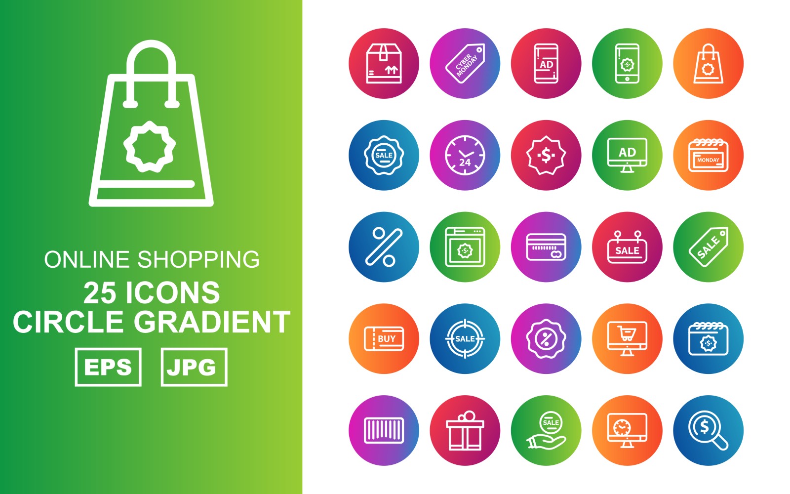 Download Набор иконок "25 Premium Online Shopping Circle Gradient Pack Icon Set" / 25 Premium Online Shopping Circle Gradient Pack Icon Set - Набор иконок на тему shopping box,browser,online shop,bar code,gift,sale,lcd,find,cyber monday,smartphone,bag,tag,clock,dollar,calendar,percentage,atm card,icon,icons