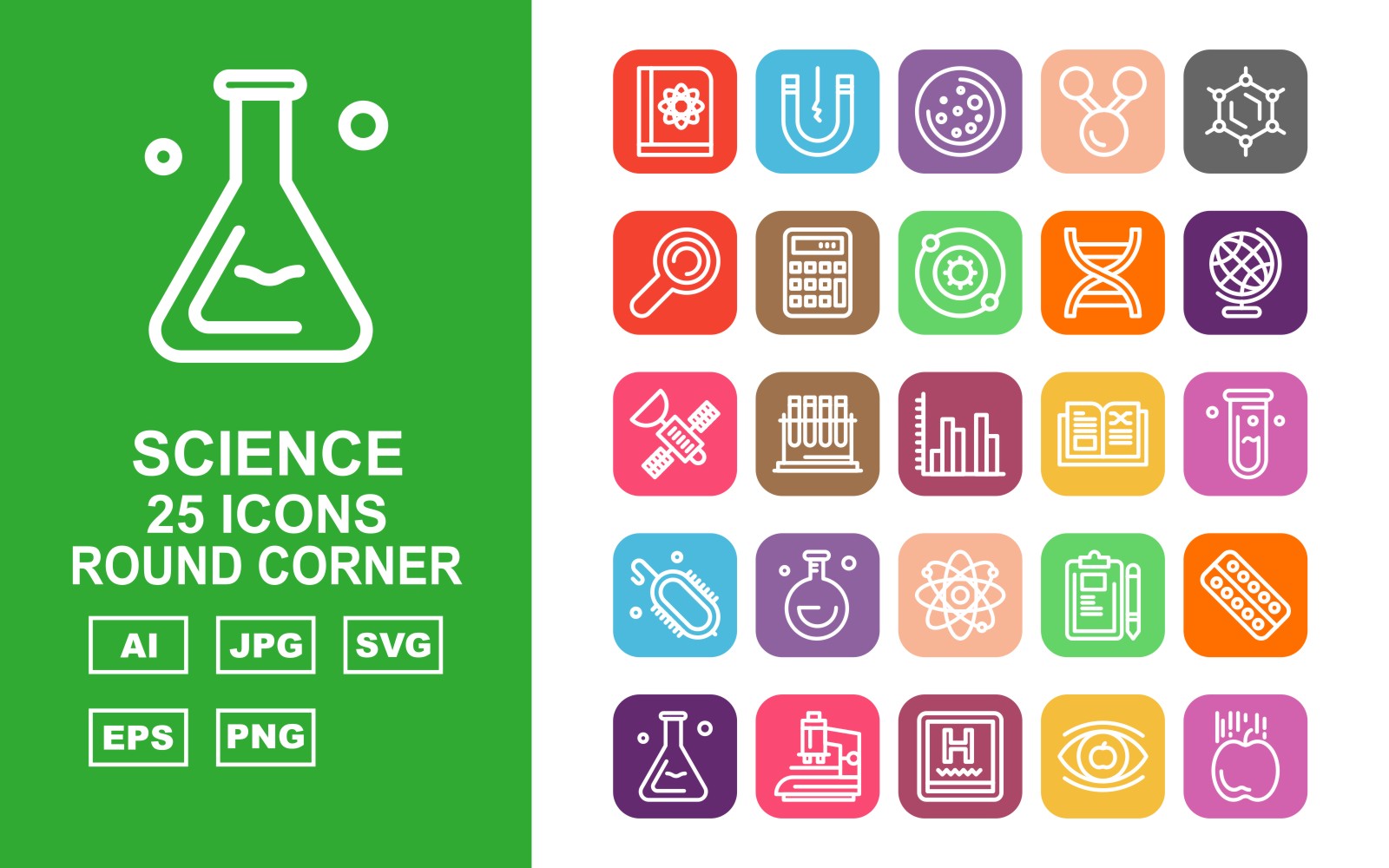 Download Набор иконок "25 Premium Science Round Corner Icon Set" / 25 Premium Science Round Corner Icon Set - Набор иконок на тему medical book,test tube,pad,medicine tablet,microscope,hospital,eye,apple,magnet,space,link,atom,find,calculator,dna,earth,satellite,graphic,electricity,icon