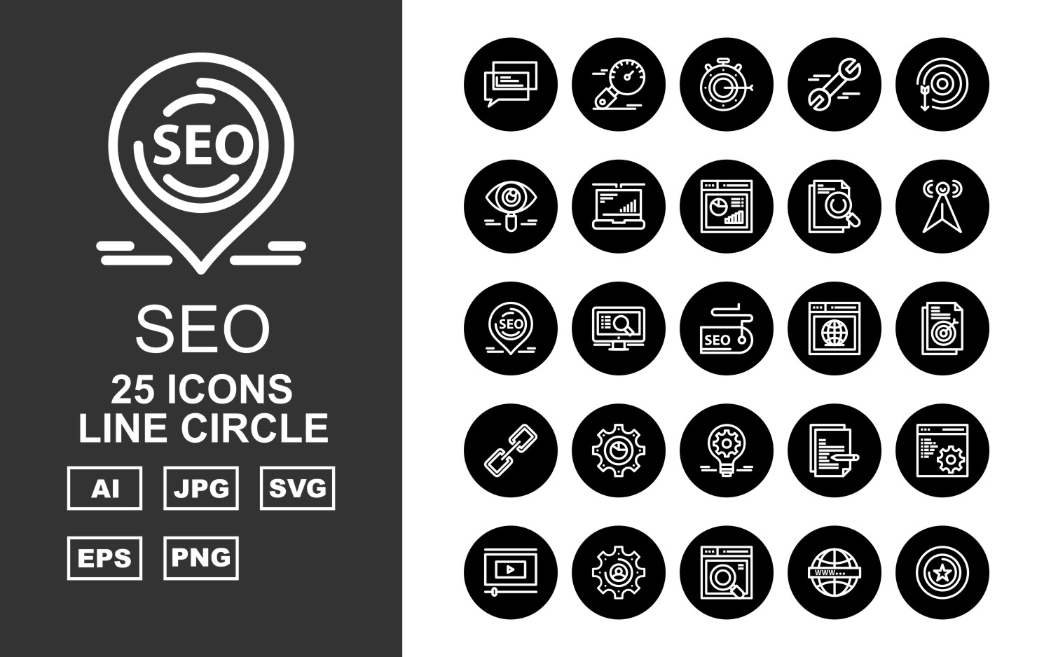 Download Набор иконок "25 Premium SEO III Line Circle Pack Icon Set" / 25 Premium SEO III Line Circle Pack Icon Set - Набор иконок на тему business chat,lcd,document,website,video player,setting,world,star,marketing,stopwatch,target,eye,laptop,chart,icon,bulb,pie,link