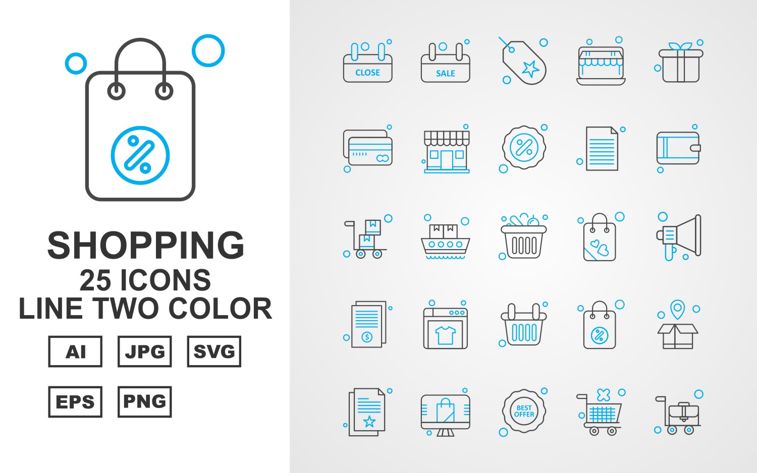 Download Набор иконок "25 Premium Shopping Line Two Color Pack Icon Set" / 25 Premium Shopping Line Two Color Pack Icon Set - Набор иконок на тему shopping label,ship,bag,box,document,best offer,trolley,shop,gift,credit card,percentage,wallet,cart,basketicon,icons