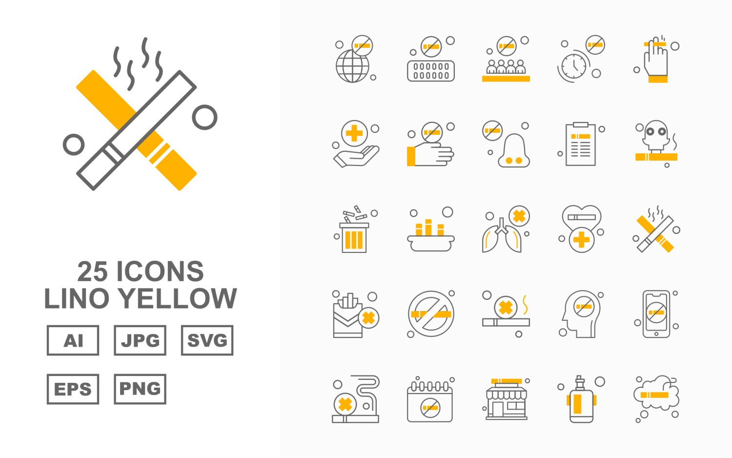 Download Набор иконок "25 Premium Smoking Lino Yellow Pack Icon Set" / 25 Premium Smoking Lino Yellow Pack Icon Set - Набор иконок на тему medical earth,smoking,man,mobile,cigarette,calendar,shop,lighter,tablet,forbidden,clock,hand,nose,document,recycle,cancer,heart,icon,icons
