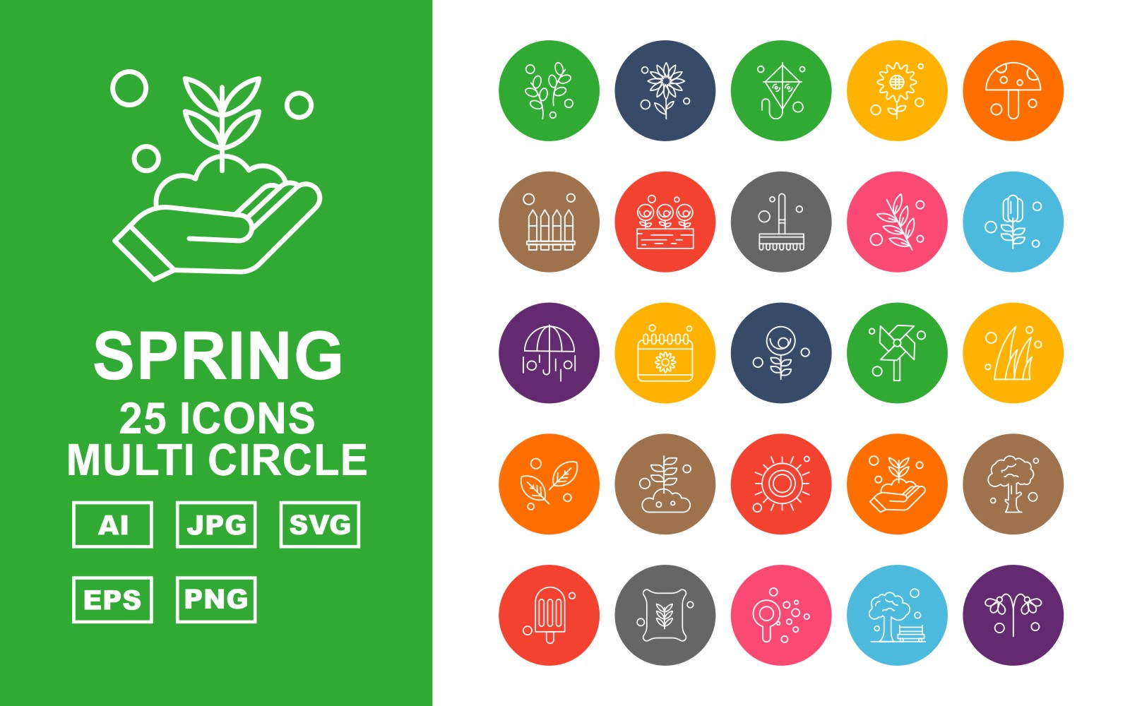 Download Набор иконок "25 Premium Spring Multi Circle Icon Set" / 25 Premium Spring Multi Circle Icon Set - Набор иконок на тему weather plant,calendar,flower,tree,ice cream,fertilizer,thermometer,kite,sunflower,mushroom,garden,rose,brush,umbrella,windmill,grass,leave,sun,icon,icons