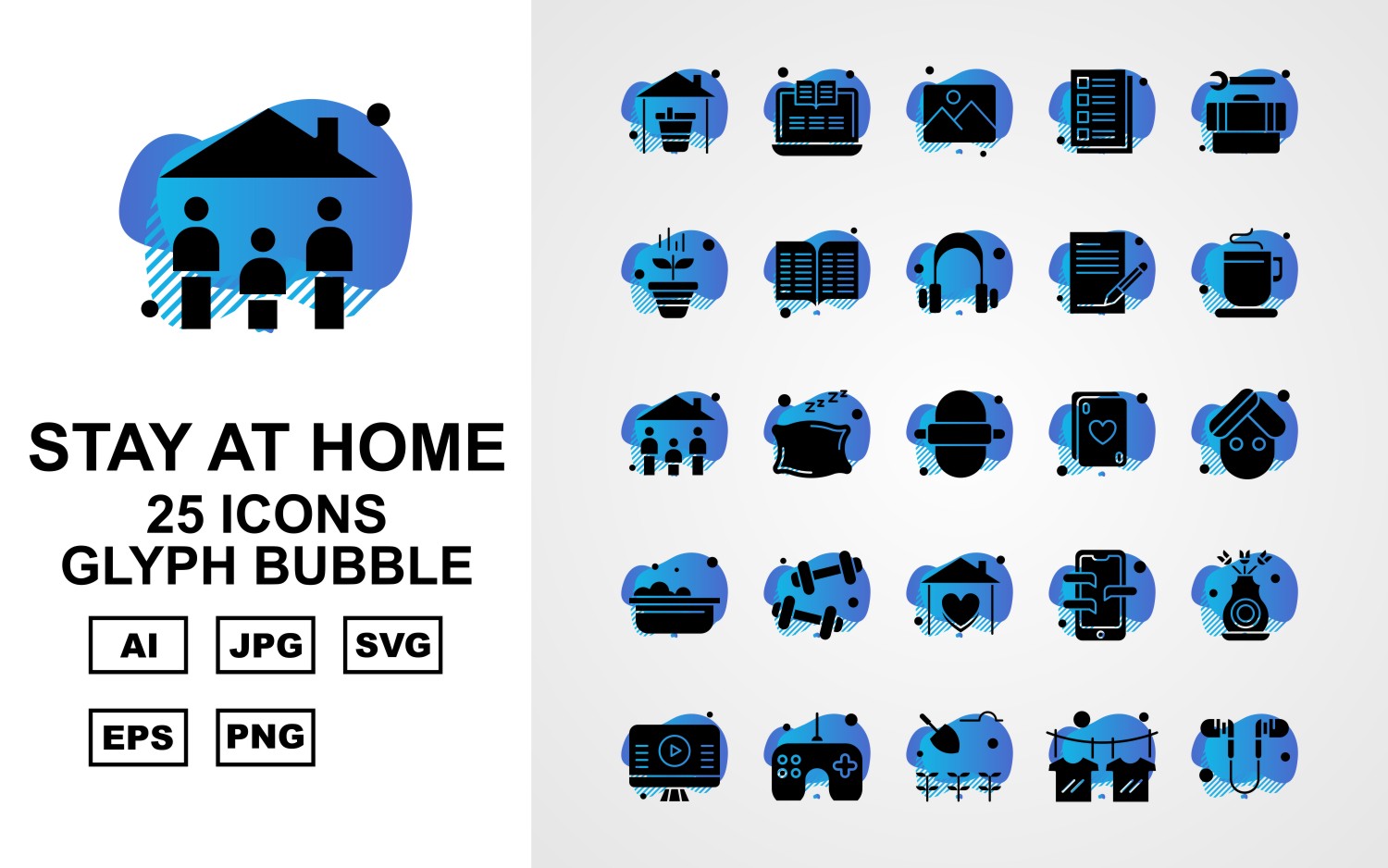 Download Набор иконок "25 Premium Stay At Home Glyph Bubble Pack Icon Set" / 25 Premium Stay At Home Glyph Bubble Pack Icon Set - Набор иконок на тему medical home,pillow,mobile,flower,lcd,joystick,agriculture,t shirt,handsfree,laptop,gallery,note,tool box,plant,book,headphone,tea,family,roti,card