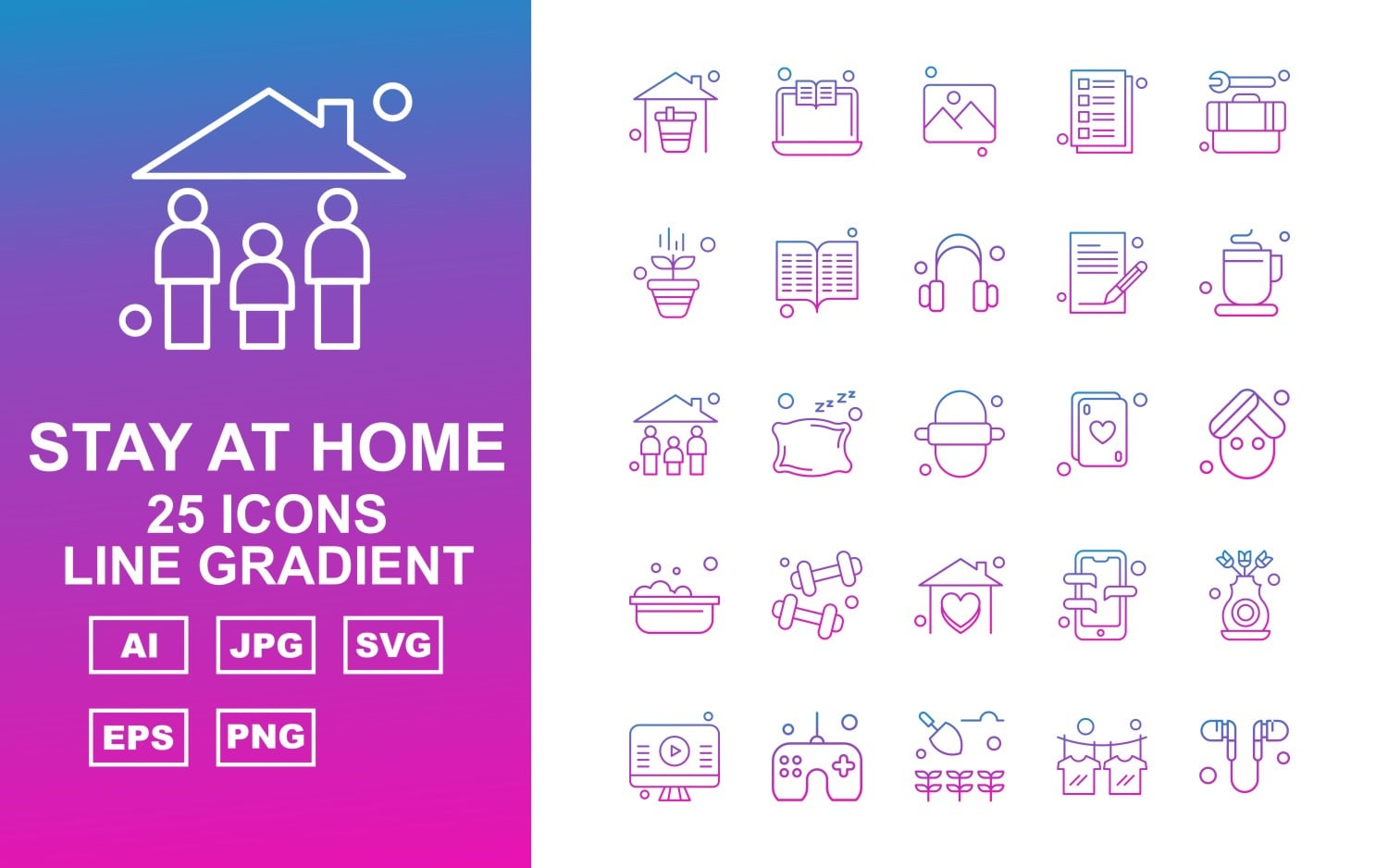 Download Набор иконок "25 Premium Stay At Home Line Gradient Pack Icon Set" / 25 Premium Stay At Home Line Gradient Pack Icon Set - Набор иконок на тему medical home,pillow,mobile,flower,lcd,joystick,agriculture,t shirt,handsfree,laptop,gallery,note,tool box,plant,book,headphone,tea,family,roti,card