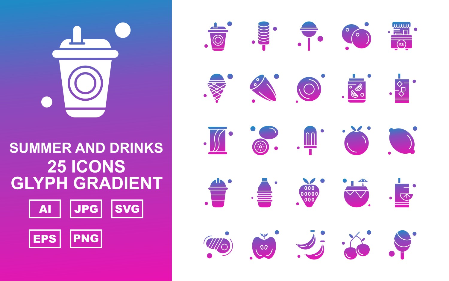 Download Набор иконок "25 Premium Summer And Drinks Glyph Gradient Pack Icon Set" / 25 Premium Summer And Drinks Glyph Gradient Pack Icon Set - Набор иконок на тему food drink,lemon,coconut water,steak,apple,banana,cherry,ice cream,candy,orange,stall,cucumber,donut,icon,icons
