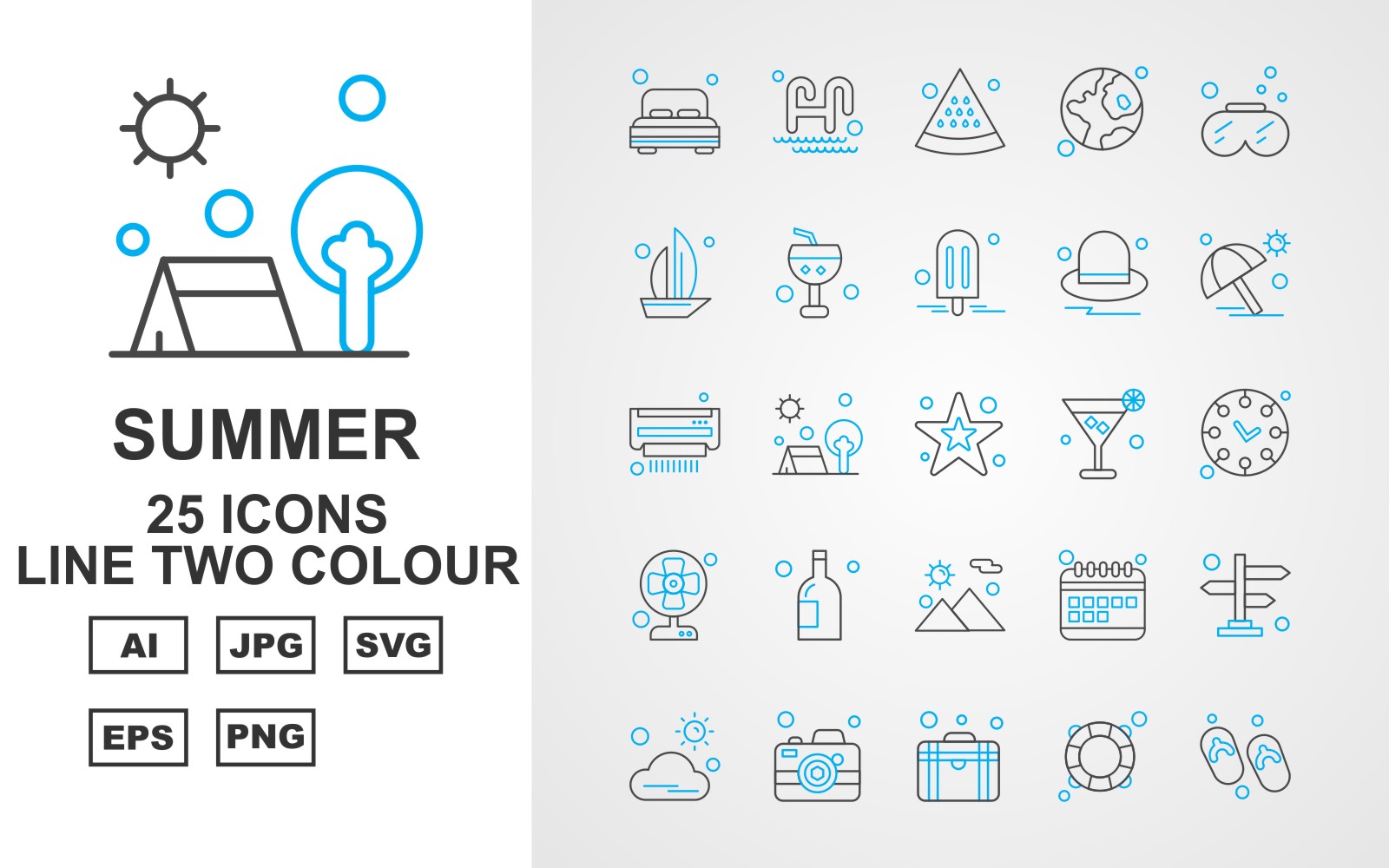 Download Набор иконок "25 Premium Summer II Line Two Color Pack Icon Set" / 25 Premium Summer II Line Two Color Pack Icon Set - Набор иконок на тему weather bedroom,outdoor,calendar,direction,cloud,camera,briefcase,swimming tube,sandal,swimming pool,watermelon,earth,snorkeling,boat,fruit juice glass,ice cream,cap,umbrella,icon,icons