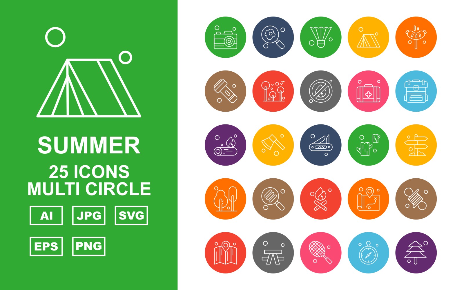 Download Набор иконок "25 Premium Summer Multi Circle Icon Pack Set" / 25 Premium Summer Multi Circle Icon Pack Set - Набор иконок на тему maps camera,axe,location,rope,map,outdoor,racket,gps,tree,find,shuttlecock,tent,hotdog,flashlight,fire,first aid,backpack,fire wood,icon,icons