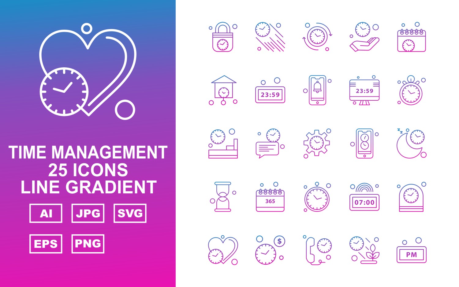 Download Набор иконок "25 Premium Time Management Line Gradient Icon Set" / 25 Premium Time Management Line Gradient Icon Set - Набор иконок на тему number lock,chat,clock,alarm,heart,telephone,plant,fast clock,reload,hand,calendar,home,watch,bell,lcd,room,setting,mobile,moon,hourglass