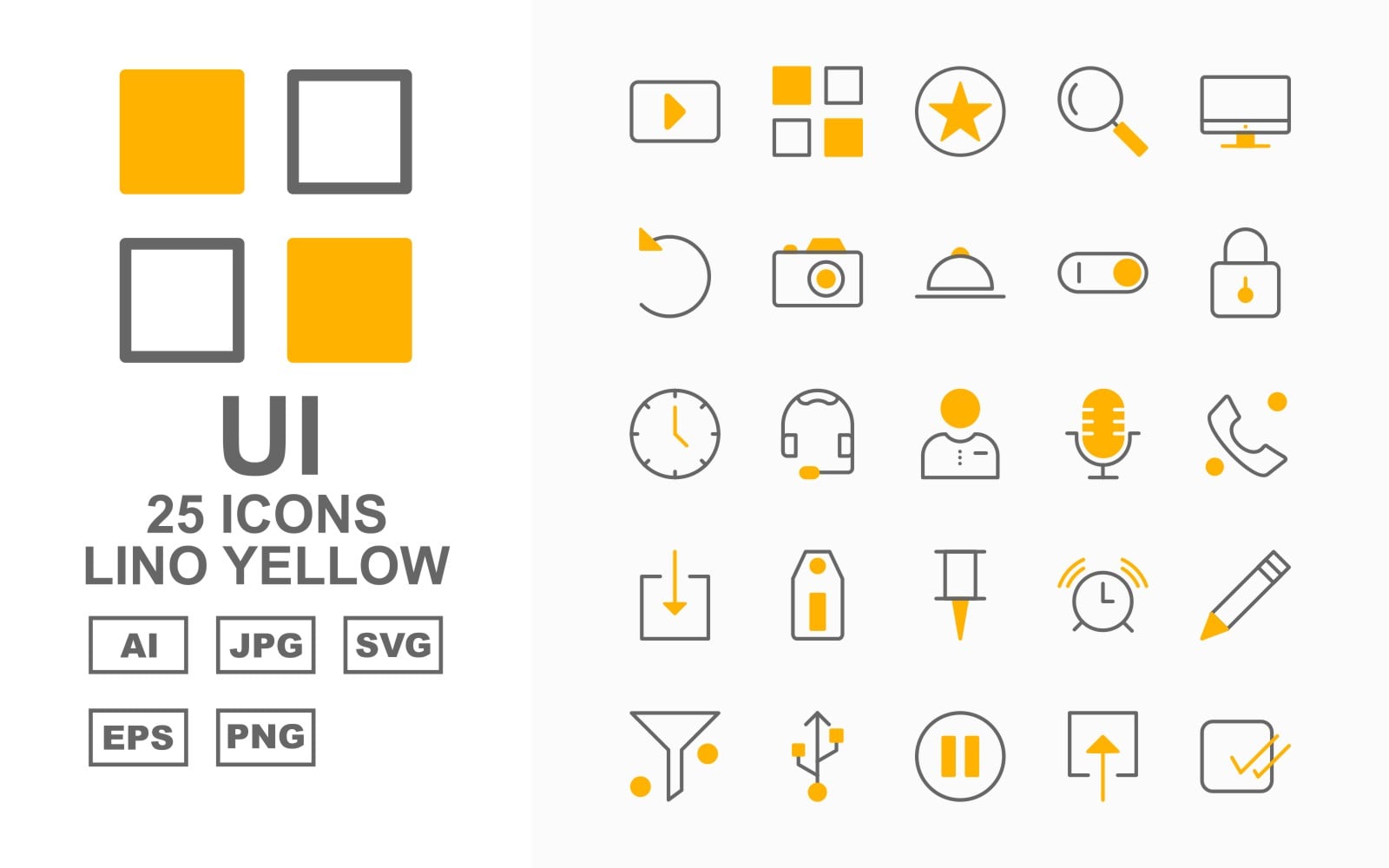 Download Набор иконок "25 Premium UI Lino Yellow Pack Icon Set" / 25 Premium UI Lino Yellow Pack Icon Set - Набор иконок на тему data play,help,pause,comment,stop,printe,rewind,compass,menu,bookmark,search,monitor,restart,camera,dish,toggle,lock,clock,man,record