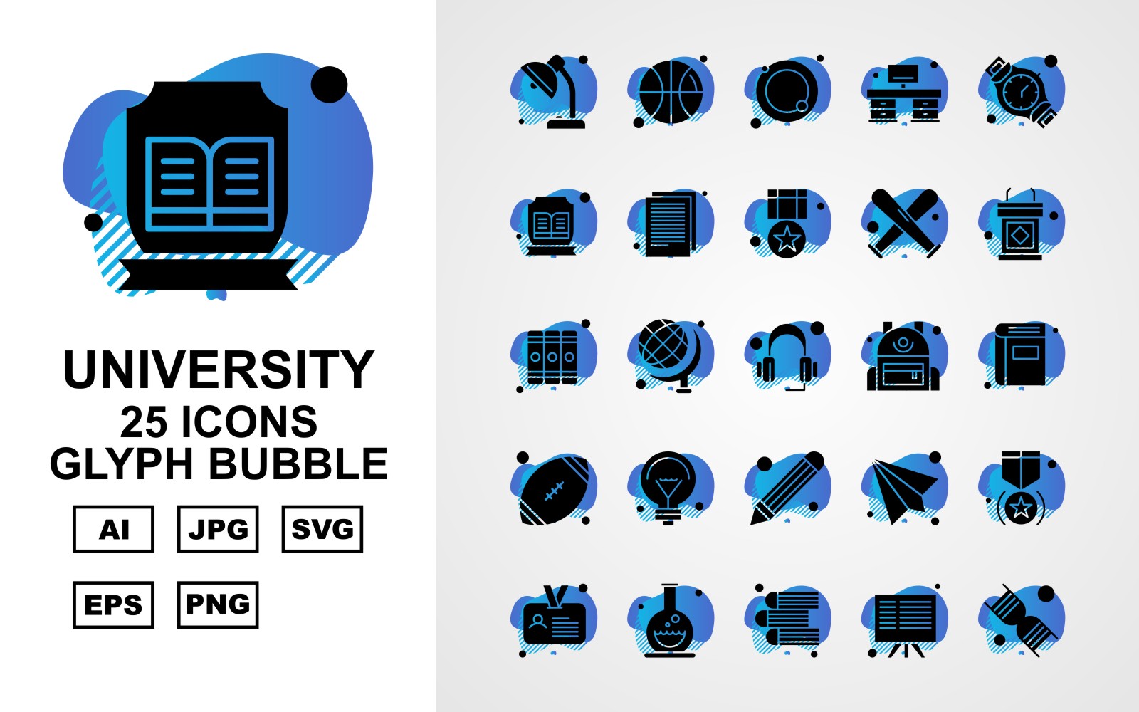 Download Набор иконок "25 Premium University Glyph Bubble Icon Set" / 25 Premium University Glyph Bubble Icon Set - Набор иконок на тему sports towel,globle,email,award,id card,test tube,book,board,dna,ball,swimming tube,office,hand watch,document,sport,rugby,icon,icons