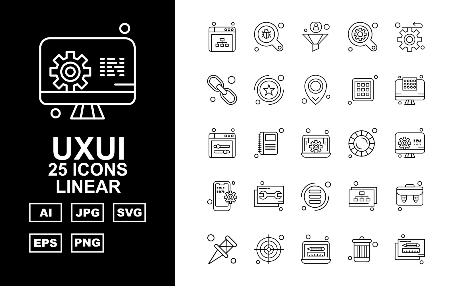 Download Набор иконок "25 Premium UXUI II Linear Icon Set" / 25 Premium UXUI II Linear Icon Set - Набор иконок на тему data browser,book,database,briefcase,pin,target,laptop,recycle,pencil,search,filter,find,gear,hyperlink,award,location,menu,display screen,icon