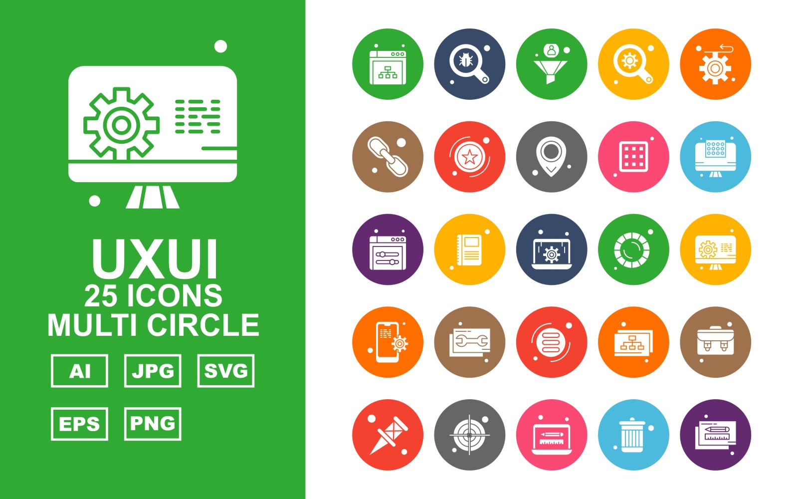Download Набор иконок "25 Premium UXUI II Multi Circle Icon Set" / 25 Premium UXUI II Multi Circle Icon Set - Набор иконок на тему data browser,book,database,briefcase,pin,target,laptop,recycle,pencil,search,filter,find,gear,hyperlink,award,location,menu,display screen,icon