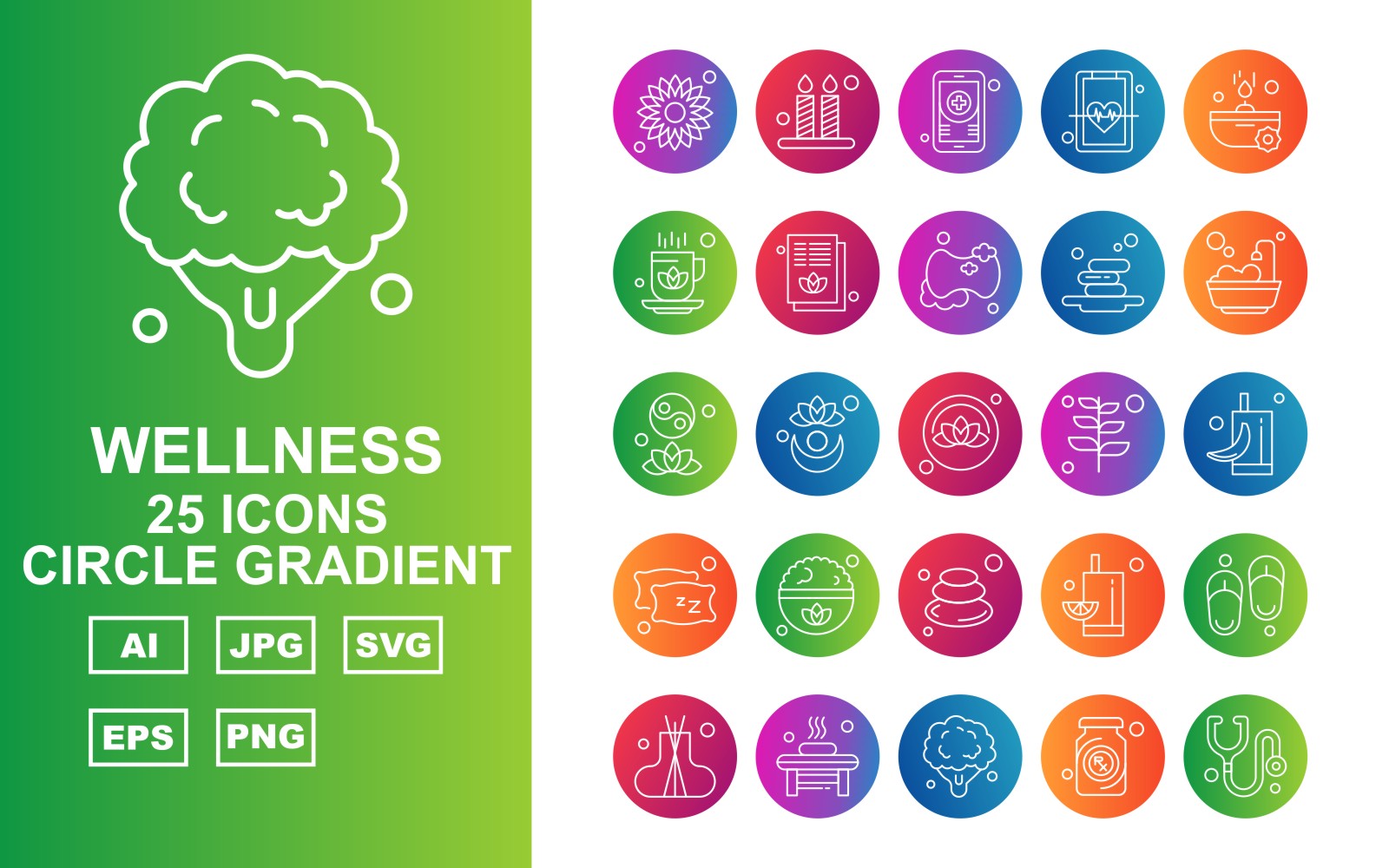 Download Набор иконок "25 Premium Wellness Circle Gradient Icon Set" / 25 Premium Wellness Circle Gradient Icon Set - Набор иконок на тему nature flower,plant,juice,slippers,incense,bathroom,broccoli,bottle,stethoscope,candle,mobile,heart,soap,cup,document,leaf,icon,icons