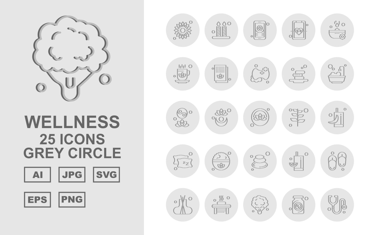 Download Набор иконок "25 Premium Wellness Grey Circle Icon Set" / 25 Premium Wellness Grey Circle Icon Set - Набор иконок на тему nature flower,plant,juice,slippers,incense,bathroom,broccoli,bottle,stethoscope,candle,mobile,heart,soap,cup,document,leaf,icon,icons