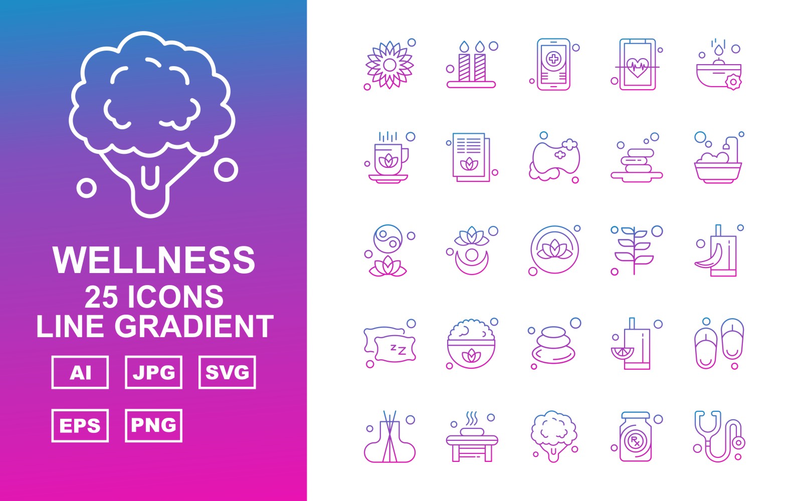 Download Набор иконок "25 Premium Wellness Line Gradient Icon Set" / 25 Premium Wellness Line Gradient Icon Set - Набор иконок на тему nature flower,plant,juice,slippers,incense,bathroom,broccoli,bottle,stethoscope,candle,mobile,heart,soap,cup,document,leaf,icon,icons