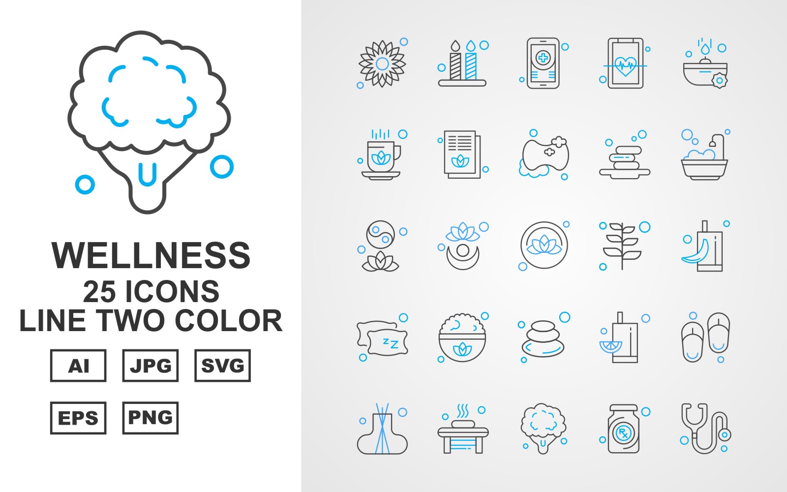Download Набор иконок "25 Premium Wellness Line Two Color Icon Set" / 25 Premium Wellness Line Two Color Icon Set - Набор иконок на тему nature flower,plant,juice,slippers,incense,bathroom,broccoli,bottle,stethoscope,candle,mobile,heart,soap,cup,document,leaf,icon,icons