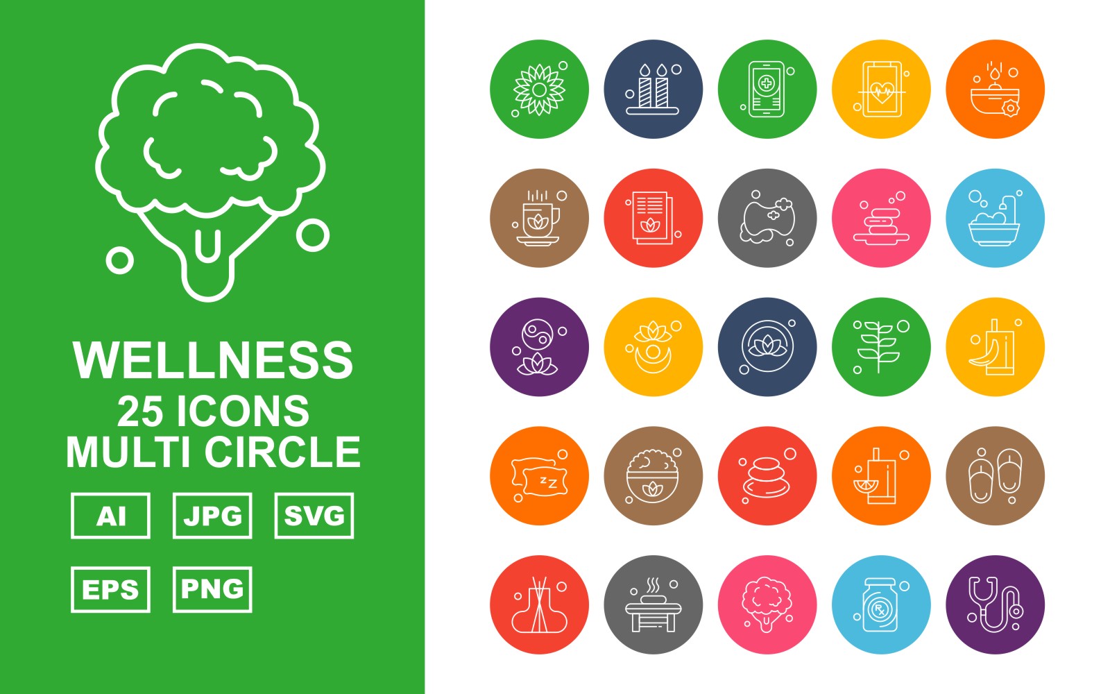 Download Набор иконок "25 Premium Wellness Multi Circle Icon Set" / 25 Premium Wellness Multi Circle Icon Set - Набор иконок на тему nature flower,plant,juice,slippers,incense,bathroom,broccoli,bottle,stethoscope,candle,mobile,heart,soap,cup,document,leaf,icon,icons