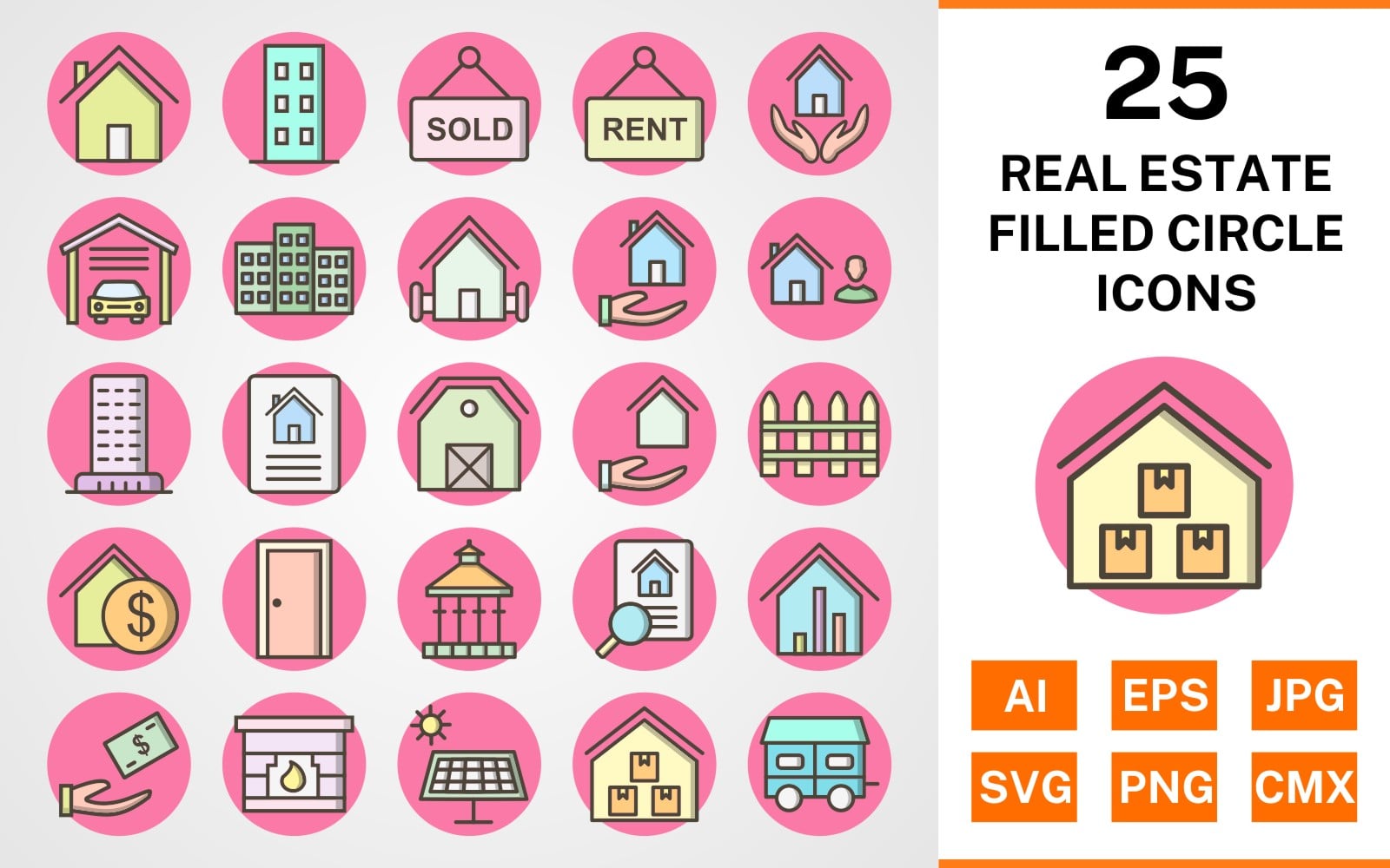 Download Набор иконок "25 Real Estate Filled Circle Icon Set" / 25 Real Estate Filled Circle Icon Set - Набор иконок на тему city set,file,icon,icons,circle,vector,sign,symbol,pictogram,filled,outline,real estate,house,garage,building,farm house,loan,agent,flat,mortgage