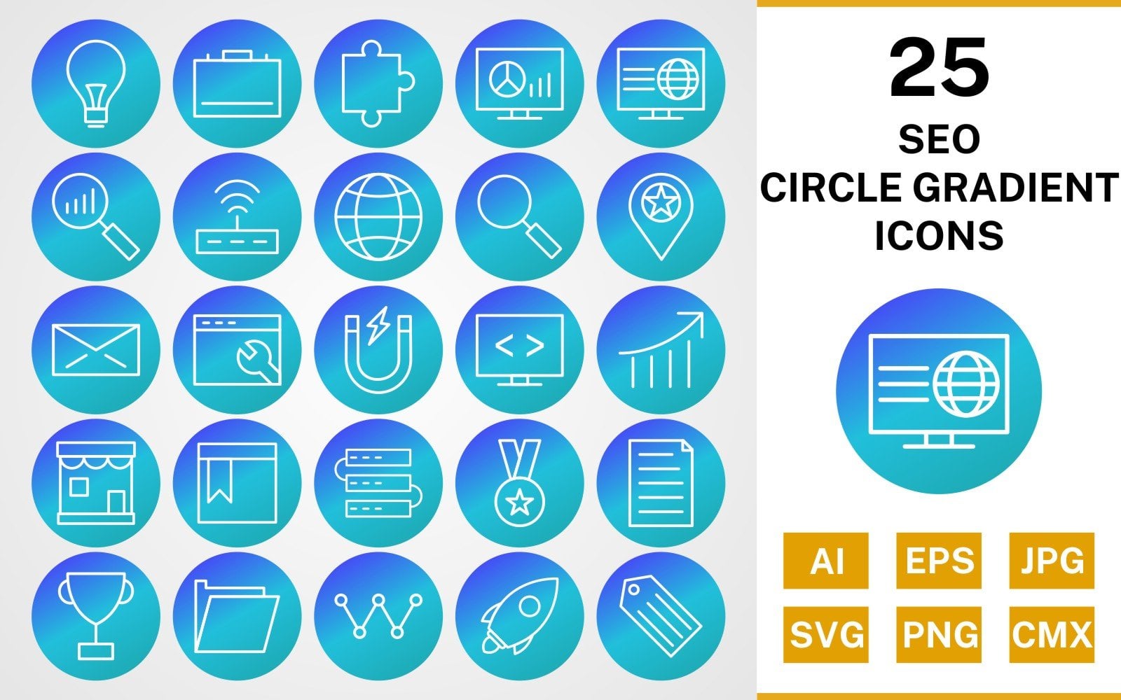 Download Набор иконок "25 SEO CIRCLE GRADIENT PACK Icon Set" / 25 SEO CIRCLE GRADIENT PACK Icon Set - Набор иконок на тему business set,file,icon,icons,line,circle,vector,sign,symbol,pictogram,gradient,seo,bulb,search,web,launch,award,servers,webpage,folder
