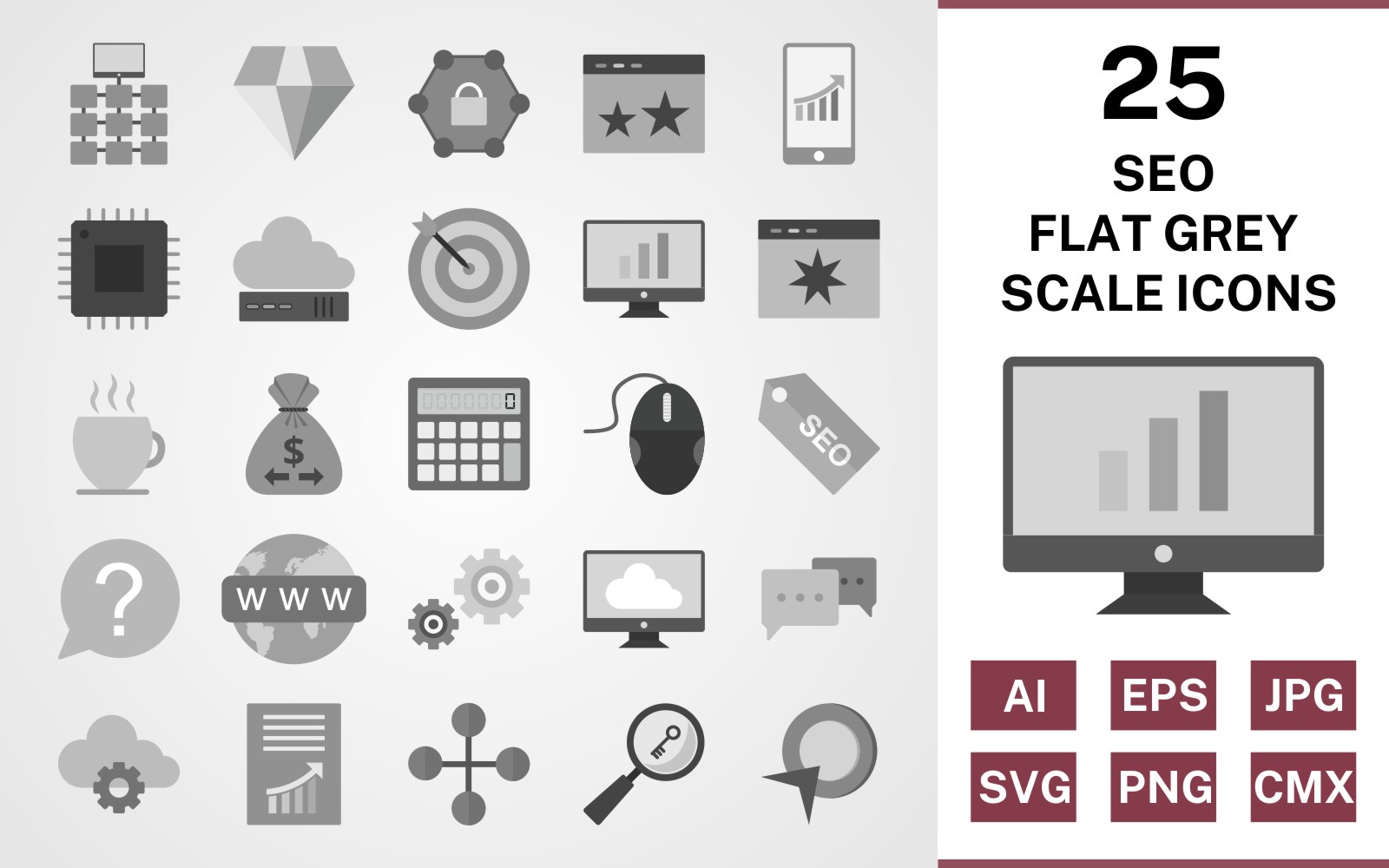 Download Набор иконок "25 Seo Flat Greyscale Icon Set" / 25 Seo Flat Greyscale Icon Set - Набор иконок на тему network set,file,icon,icons,flat,vector,sign,symbol,pictogram,greyscale,seo,network,settings,stats,diamond,conversation,starred,target,processor