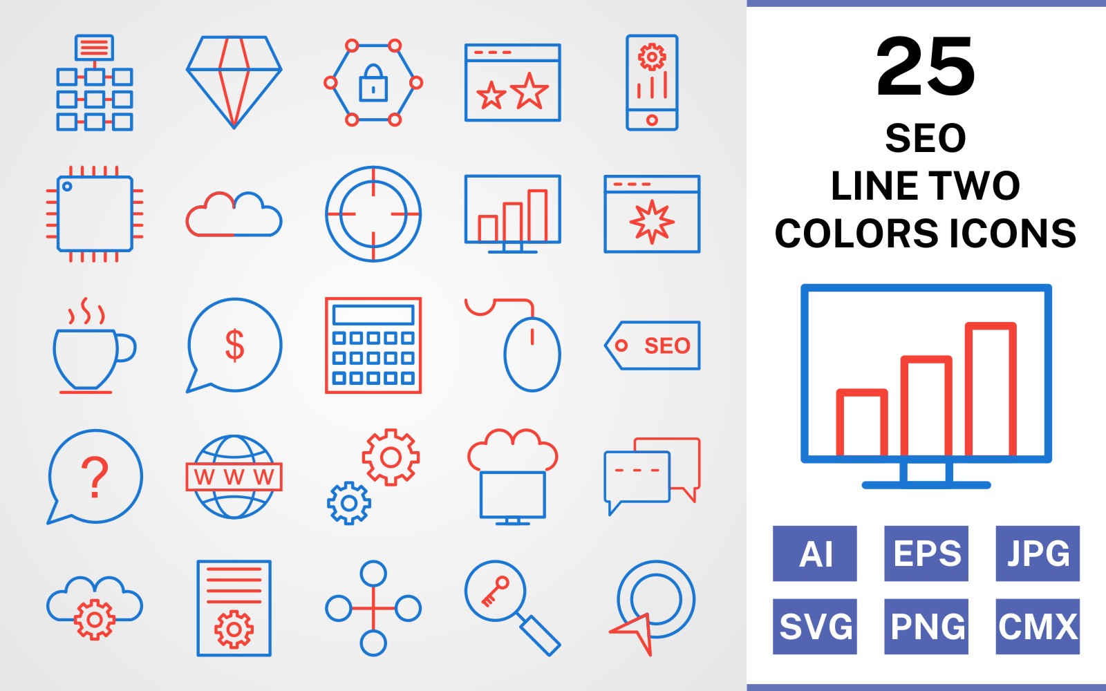 Download Набор иконок "25 Seo Line Two Colors Icon Set" / 25 Seo Line Two Colors Icon Set - Набор иконок на тему network set,file,icon,icons,line,vector,sign,symbol,pictogram,two,colors,seo,network,settings,stats,diamond,conversation,starred,target,processor