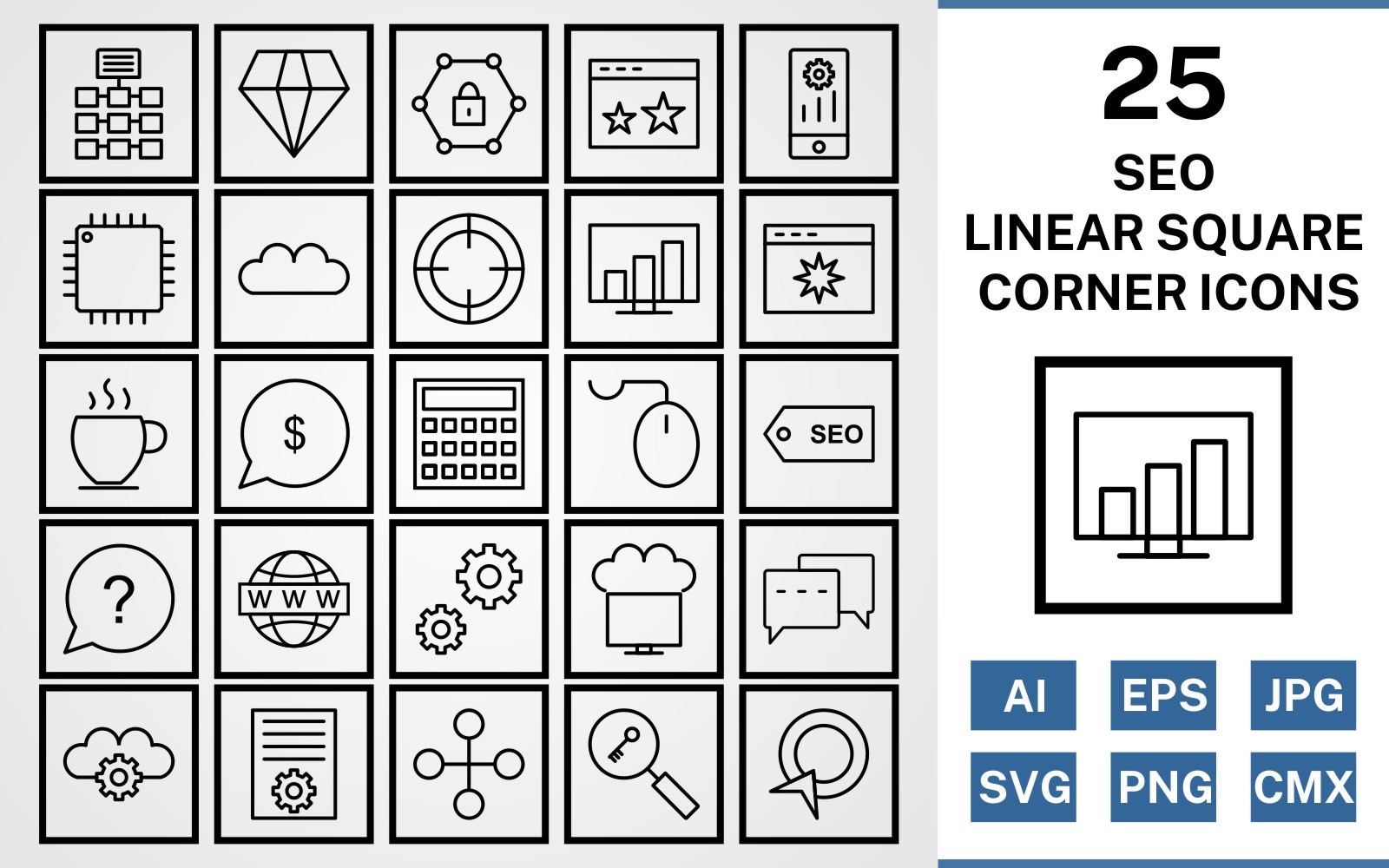Download Набор иконок "25 Seo Linear Square Corner Pack Icon Set" / 25 Seo Linear Square Corner Pack Icon Set - Набор иконок на тему network set,file,icon,icons,square,linear,vector,sign,symbol,pictogram,corner,seo,network,settings,stats,diamond,conversation,starred,target,processor