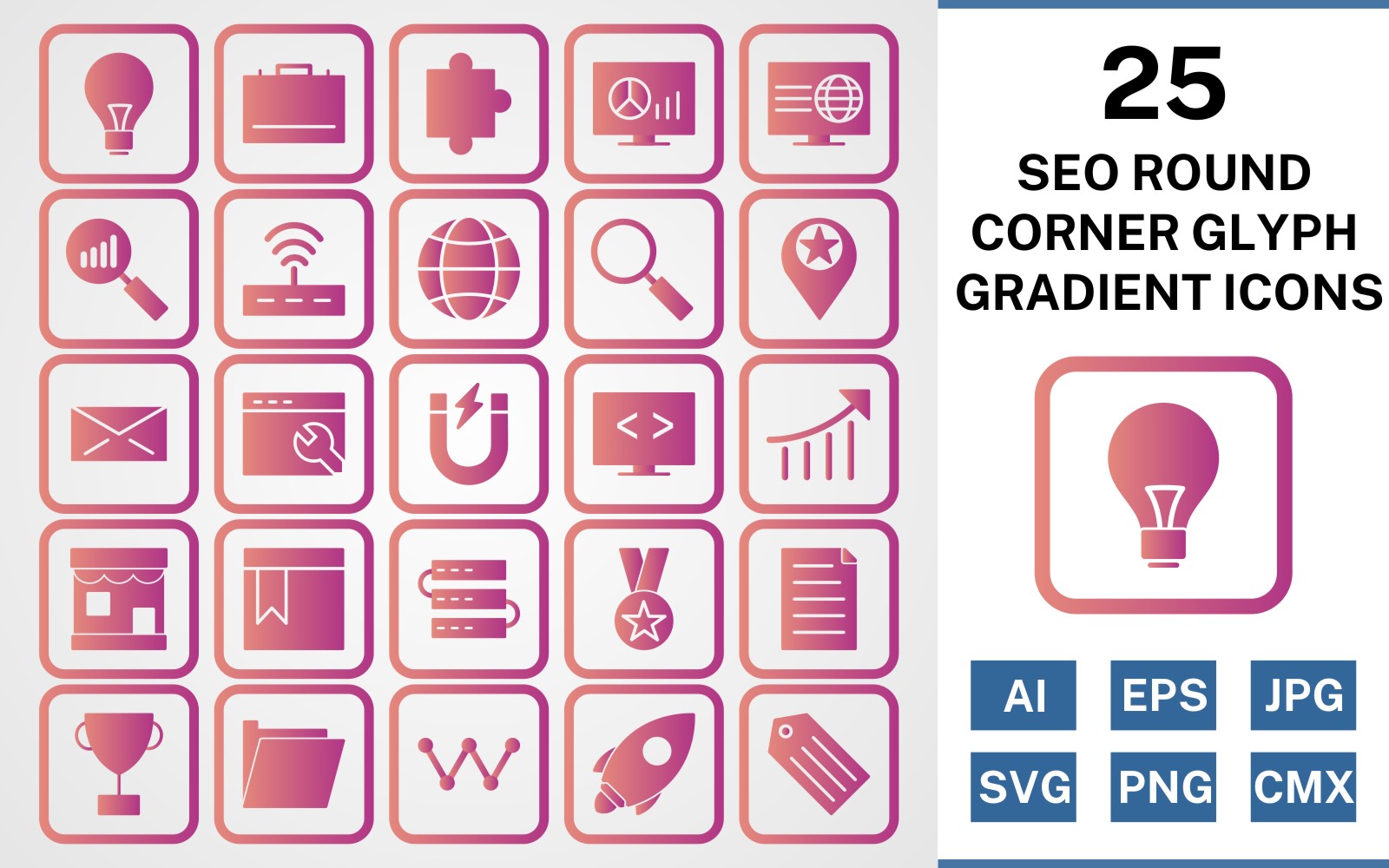 Download Набор иконок "25 Seo Round Corner Glyph Gradient Icon Set" / 25 Seo Round Corner Glyph Gradient Icon Set - Набор иконок на тему business set,file,icon,icons,round,corner,vector,sign,symbol,pictogram,line gradient,seo,bulb,search,web,launch,award,servers,webpage,folder