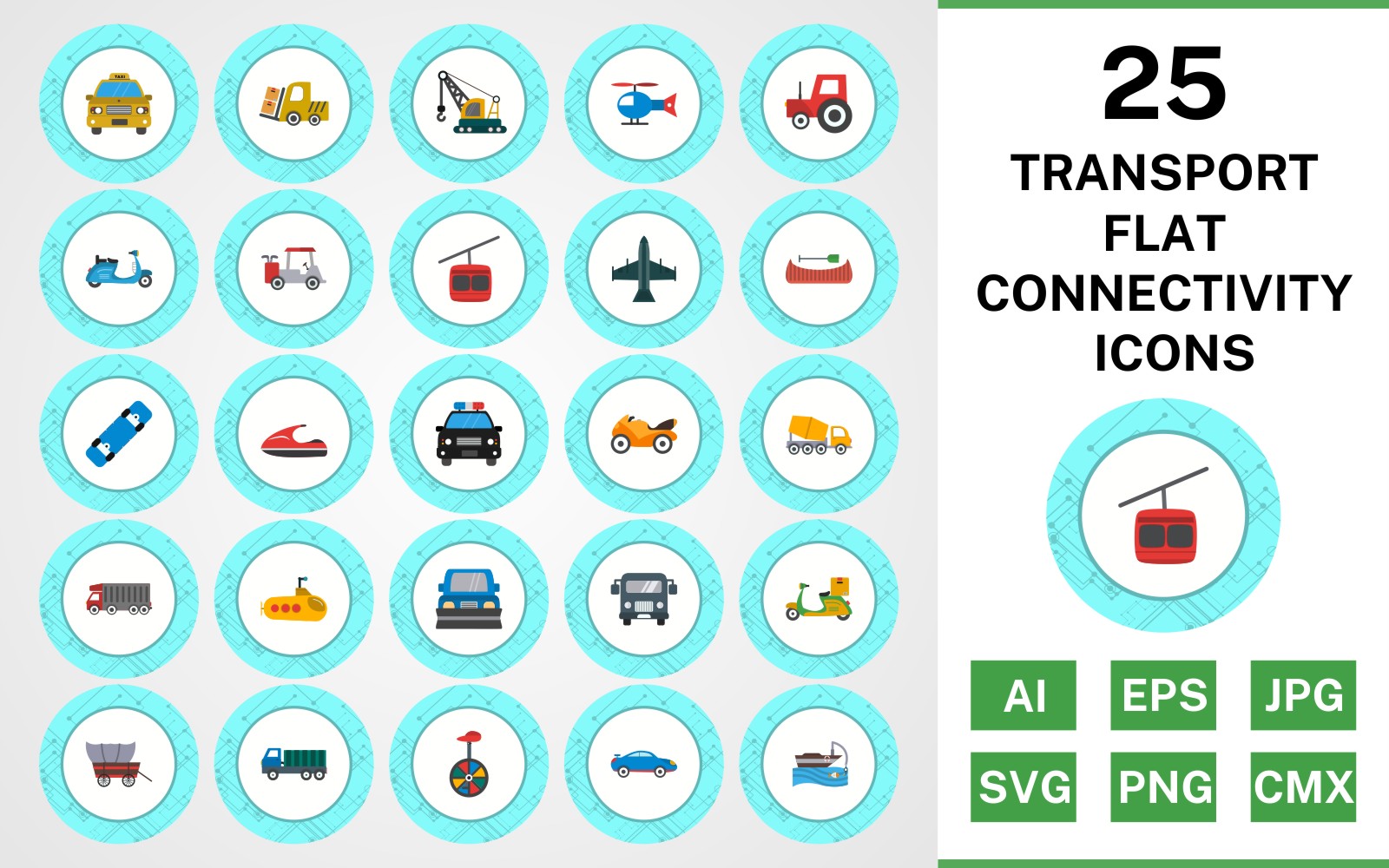 Download Набор иконок "25 Transport Flat Connectivity Icon Set" / 25 Transport Flat Connectivity Icon Set - Набор иконок на тему transport set,file,icon,icons,flat,vector,sign,symbol,pictogram,connectivity,transport,taxi,wagon,dumper,submarine,golf cart,vespa,loader,fishing boat,jet ski