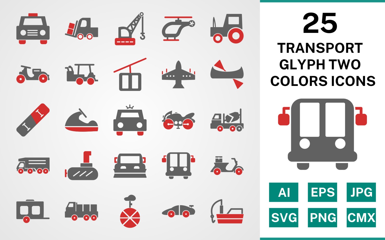 Download Набор иконок "25 Transport Glyph Two Colors Icon Set" / 25 Transport Glyph Two Colors Icon Set - Набор иконок на тему transport set,file,icon,icons,glyph,vector,sign,symbol,pictogram,two colors,transport,taxi,wagon,dumper,submarine,golf cart,vespa,loader,fishing boat,jet ski
