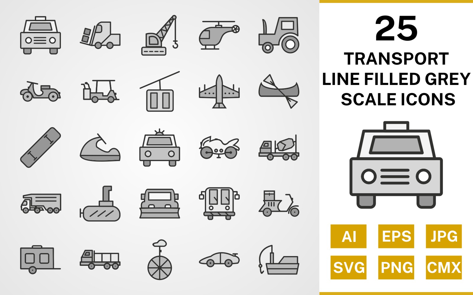 Download Набор иконок "25 Transport Line Filled Greyscale Icon Set" / 25 Transport Line Filled Greyscale Icon Set - Набор иконок на тему transport set,file,icon,icons,line,filled,vector,sign,symbol,pictogram,greyscale,transport,taxi,wagon,dumper,submarine,golf cart,vespa,loader,fishing boat