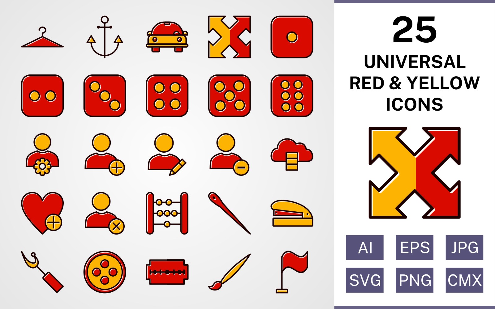 Download Набор иконок "25 Universal Filled Red And Yellow Icon Set" / 25 Universal Filled Red And Yellow Icon Set - Набор иконок set,file,icon,icons,red,vector,sign,symbol,pictogram,yellow,filled,universal,hanger,dice six,flag,needle,edit profile,staper,button,blade