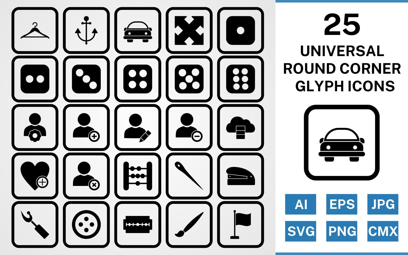 Download Набор иконок "25 Universal Round Corner Glyph Black Icon Set" / 25 Universal Round Corner Glyph Black Icon Set - Набор иконок set,file,icon,icons,round,vector,sign,symbol,pictogram,corner,glyph,universal,hanger,dice six,flag,needle,edit profile,staper,button,blade