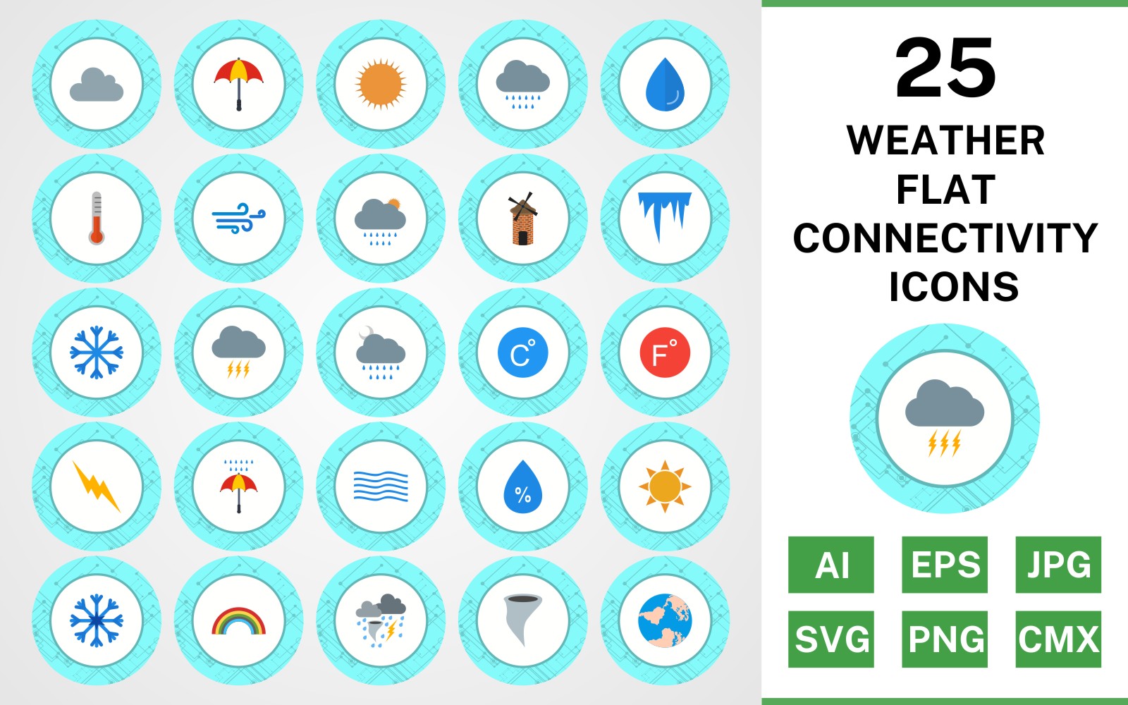 Download Набор иконок "25 Weather Flat Connectivity Icon Set" / 25 Weather Flat Connectivity Icon Set - Набор иконок на тему weather set,file,icon,icons,flat,vector,sign,symbol,pictogram,connectivity,weather,cloud,rain,sun,tornado,rainbow,windy,rain drop,temparature,snow flake