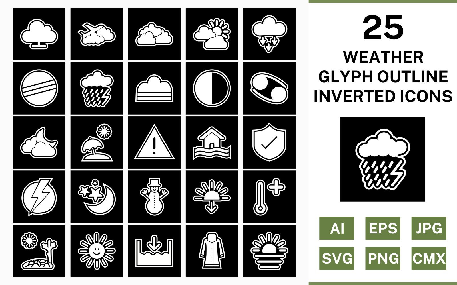 Download Набор иконок "25 Weather Glyph Outline Inverted Icon Set" / 25 Weather Glyph Outline Inverted Icon Set - Набор иконок на тему weather set,file,icon,icons,outline,vector,sign,symbol,pictogram,glyph,inverted,weather,cloudy,hot,sunset,sheild,fog,beach umbella,snowman,dark ray