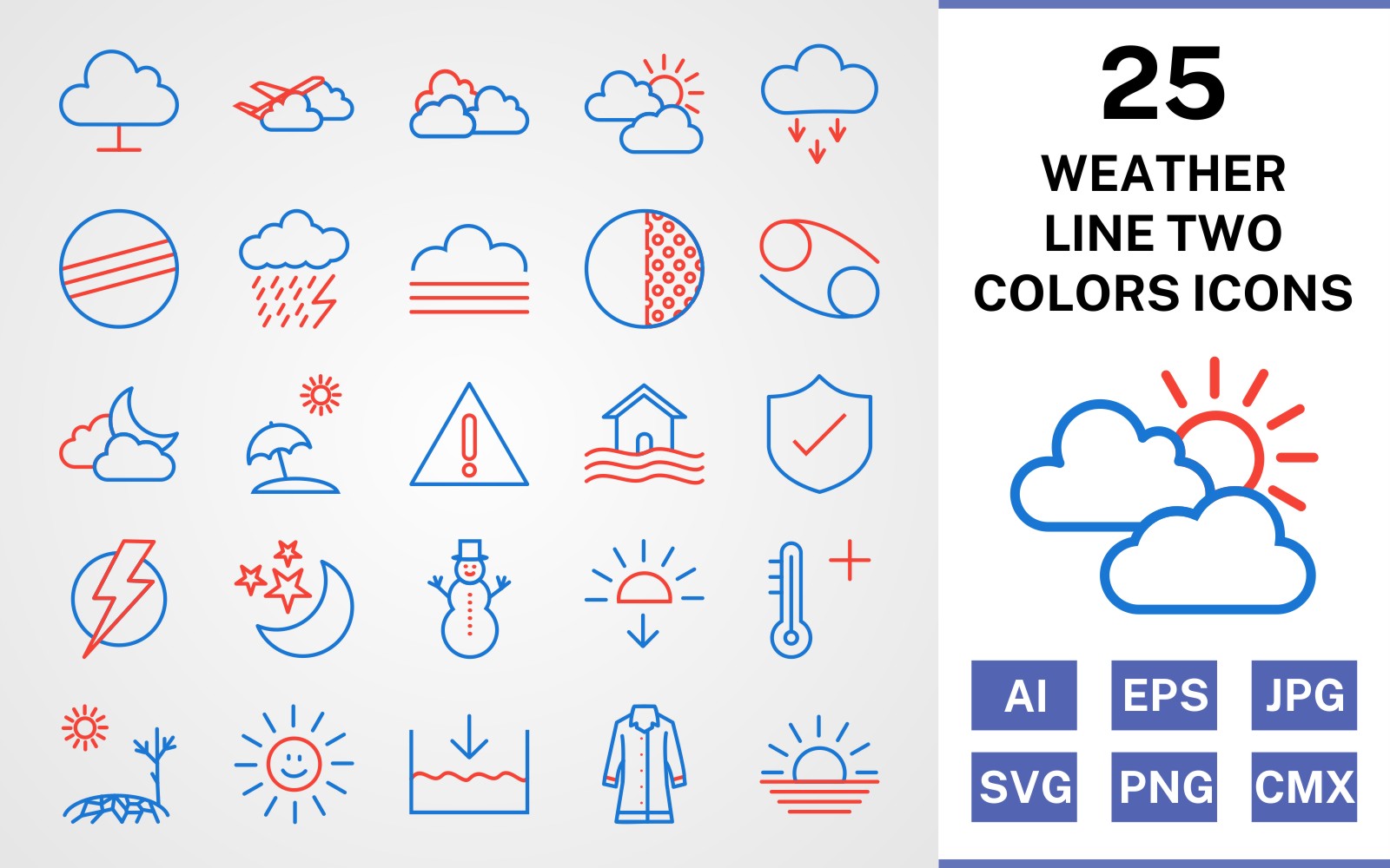 Download Набор иконок "25 Weather Line Two Colors Icon Set" / 25 Weather Line Two Colors Icon Set - Набор иконок на тему weather set,file,icon,icons,line,vector,sign,symbol,pictogram,two,colors,weather,cloudy,hot,sunset,sheild,fog,beach umbella,snowman,dark ray