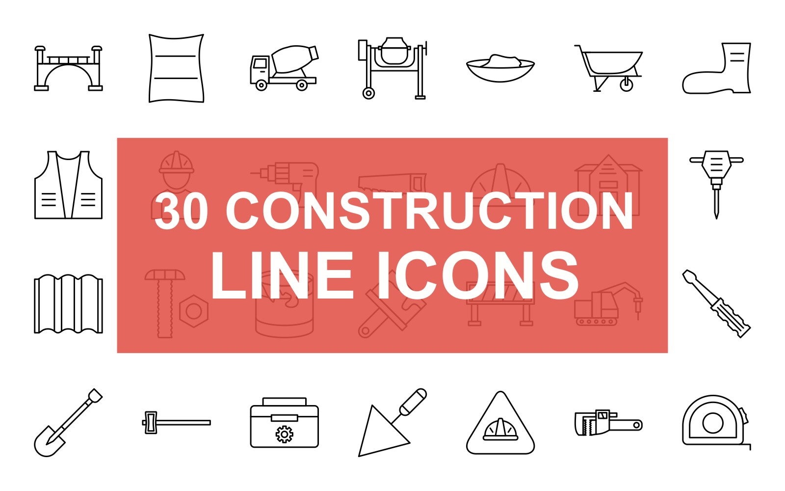 Download Набор иконок "30 Construction Line Icon Set" / 30 Construction Line Icon Set - Набор иконок на тему графика bridge,cement,bag,mixer,truck,mixing,tray,trolley,construction,boots,cone,jacket,worker,drill,handsaw,helmet,house,jack,hammer,measuring